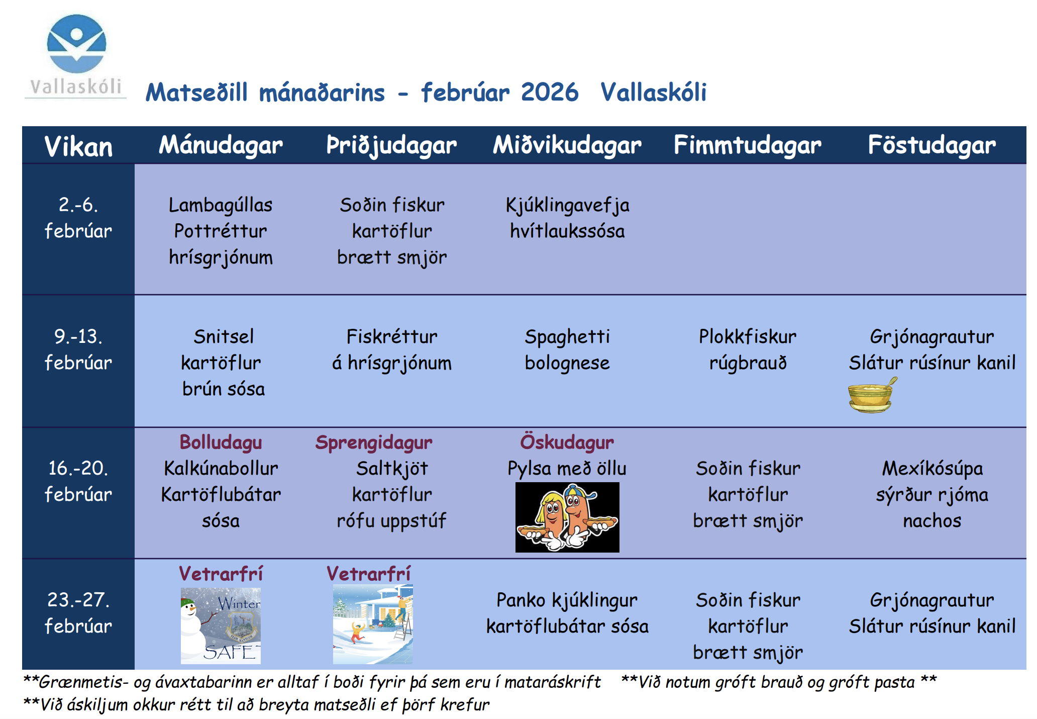 Spánýr matseðill mötuneytis Vallaskóla birtist ykkur hér með. Á honum er að finna fjölda listugra rétta sem eiga eftir að kitla bragðlaukana í febrúarmánuði. Hér er matseðillin á PDF formi til útprentunar: